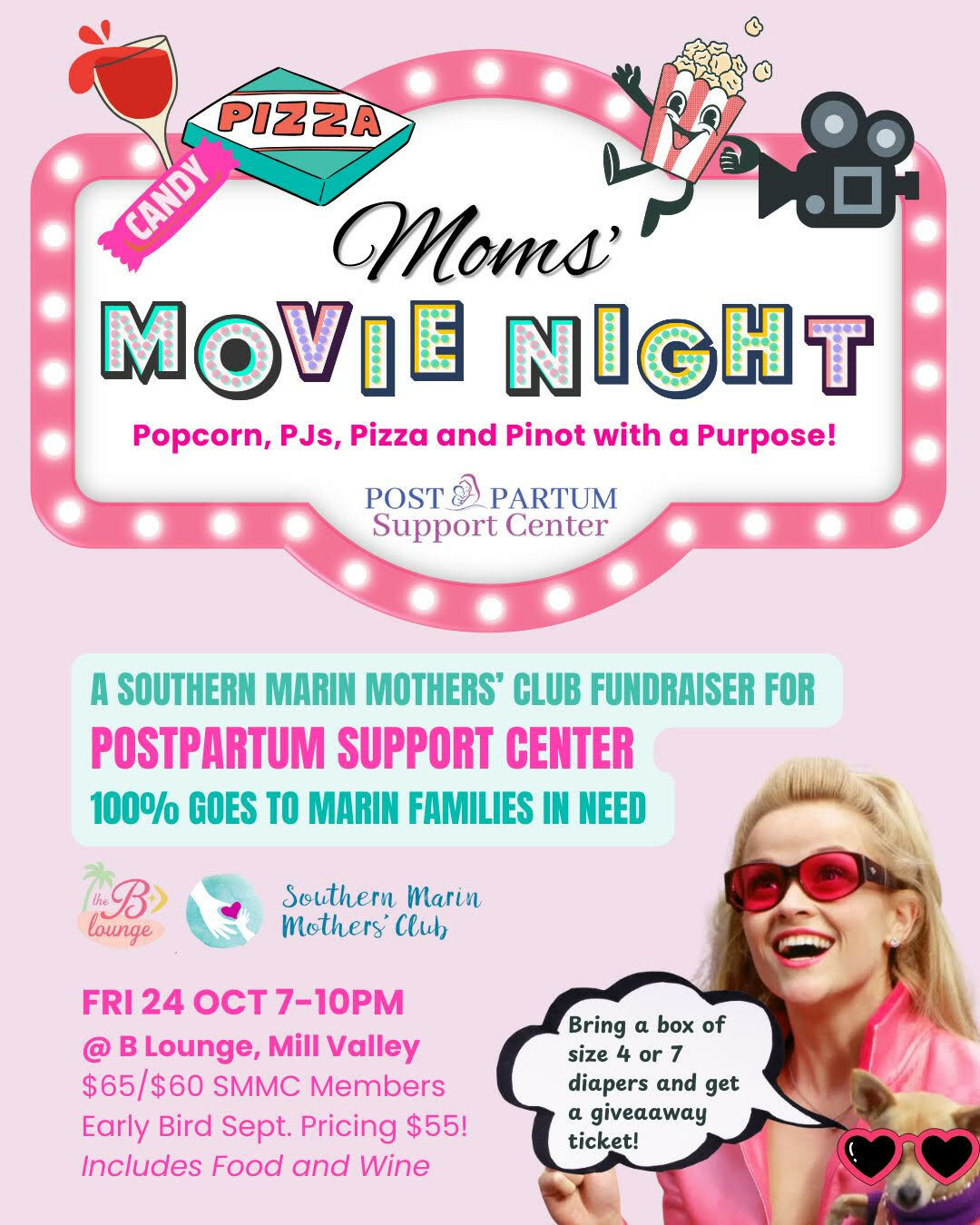 Slip into your comfiest PJs or sweats, grab your girlfriends, and join us for a Legally Blonde-themed moms’ movie night to raise funds for the Postpartum Support Center’s Marin Diaper Bank. We’re serving up pizza (the good kind), superb wine selections, endless popcorn, a candy bar and lots of cozy pink vibes. Plus, enjoy a fun trivia game and giveaway prizes you’ll love.